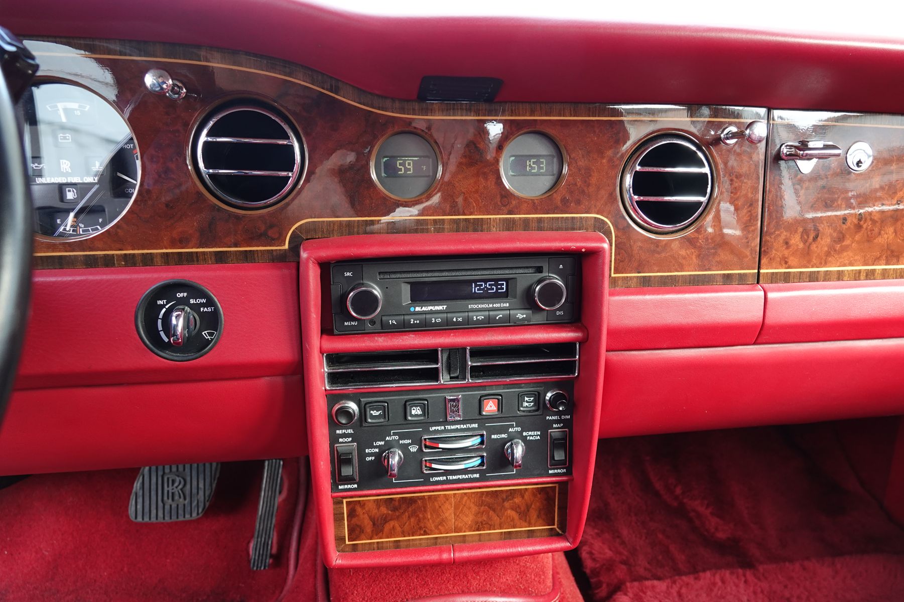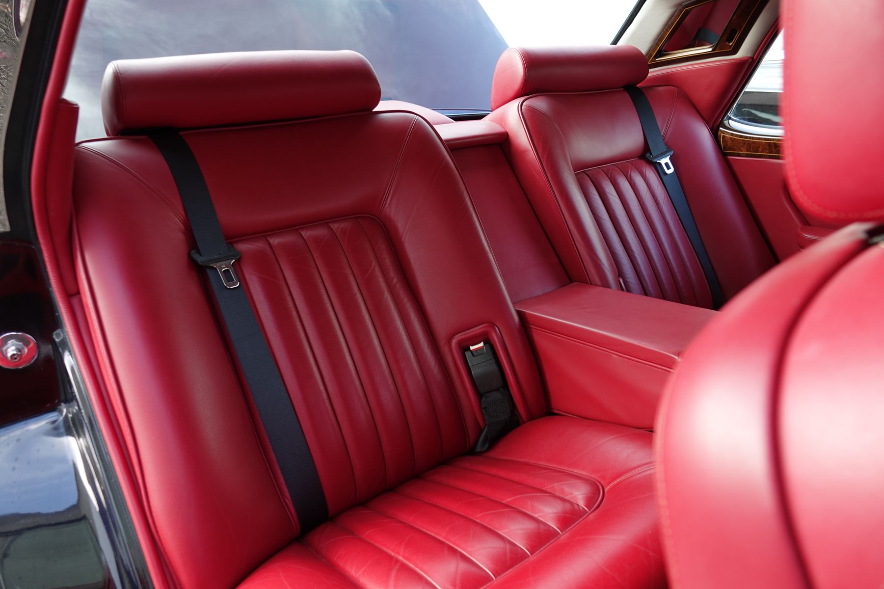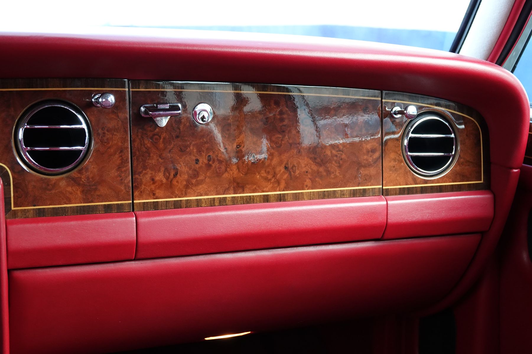 L'intérieur constitue le point d'orgue de cette sublime auto, d'abord pour sa très belle et rare couleur Saint James red, ensuite pour son état qu'il faut qualifier d'exceptionnel.